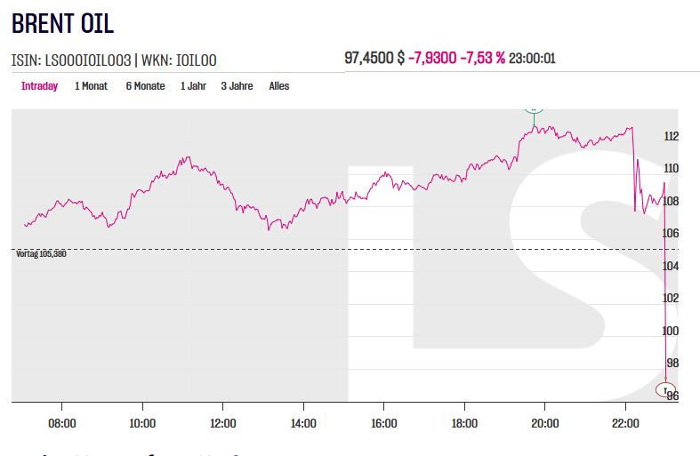 Die Aussagen Trumps und die Aussagen bzw. das Handeln Israels passen absolut nicht zueinander. Gestern Abend sagte Trump noch, er erwäge ein Zurückfahren der Angriffe. Der Ölpreis fiel auf 97 Dollar pro Barrel auf LS.