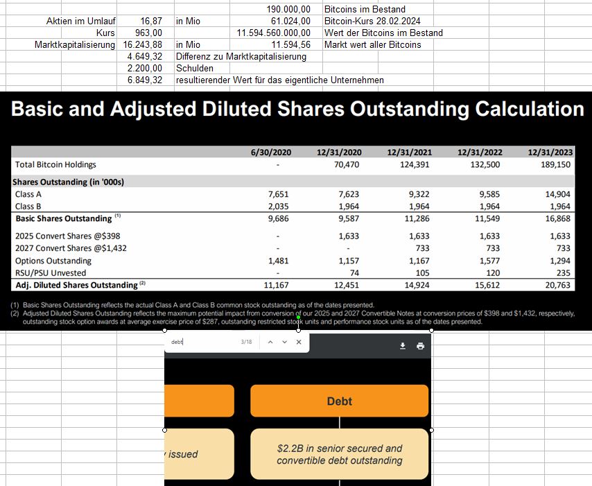 basierend auf dem letzten Geschäftsbericht (10-K-Form, Seite 107) und den dort ausgewiesenen "diluted shares" in höhe von 16,7 Mio. Stück ergibt sich eine Marktkapitalisierung, die doppelt so hoch ist wie der Wert des Bitcoin-Bestandes von Microstrategy.