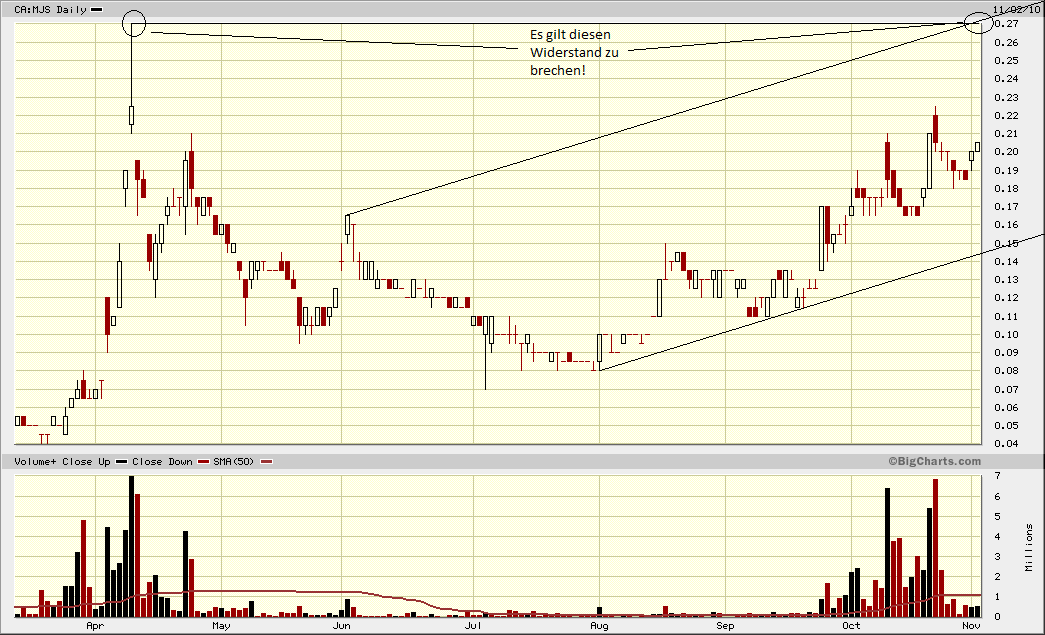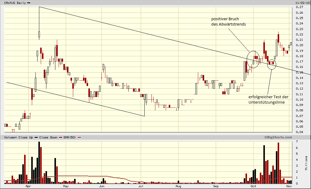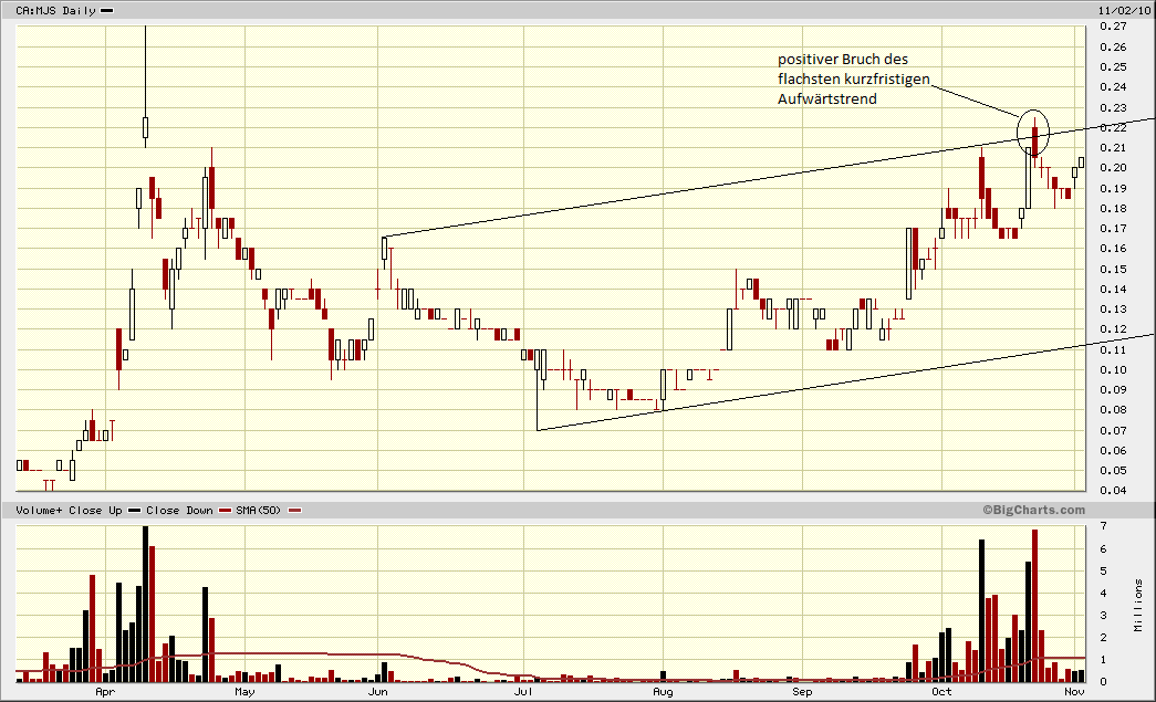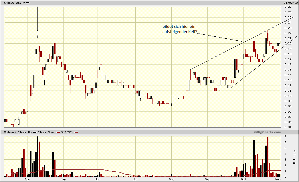 Das Chartbild aus #136 bedeutet demnach für mich: Es ist sehr wahrschein­lich, dass der Kurs in naher Zukunft wie über 0,22 CAD gehen wird, für den Bruch der Marke um 0,27 CAD gibt es sozusagen noch keine "Aussage" vom Chart!