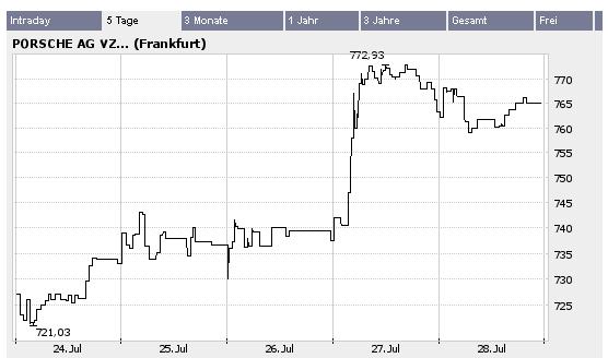 Seine neueste Masche ist aber überhaupt das Letzte: tagtäglich erwähnt er jetzt irgendwelche neuen Aktien mit dem Kommentar à la "Wir kaufen eine erste Position". Er nimmt diese Teile absichtlich nicht in sein Depot auf, weil er ganz genau weiß, dass das genauso ein Schuss ins Knie sein kann. Seine Beobachtungsliste ändert sich tagtäglich mit immer neuen skurilleren Kommentaren z.B. "Bei SolarWorld erwarte ich eine Korrektur", "Bei Porsche abwarten mit Einstieg" etc. Beide Aktien sind in letzter Zeit stark gestiegen...