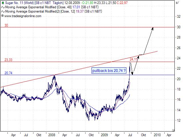 Noch sollte man die Minus 6% als Korrektur im Aufwärtstrend ansehen, ein Preisziel von 25-30 Cents bleibt realistisch. Longs sollten aber mit SL abgesichert werden, denn Korrekturen am Rohstoffmarkt fallen meist heftiger aus als am Aktienmarkt: Man stelle sich nur mal vor, der Dax würde innerhalb weniger Minuten so wie Zucker 6% verlieren, uiuiui.