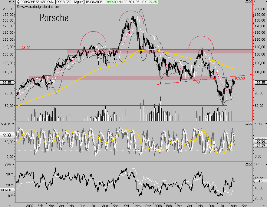 Deshalb mache ich mir um VW wenig Sorgen, wenn sie nicht mit Porsche zusammen kommen sollten. Der Kurs würde sicher auf ein fundamenta­l gerechtfer­tigtes Niveau zurück gehen, doch der derzeitig Trend würde nicht beeinfluss­t.  Und sollte der Zusammensc­hluss mit Porsche unter einer anderen Führung als Wiedeking erfolgen, so müsste noch nicht einmal der Kurs absacken.