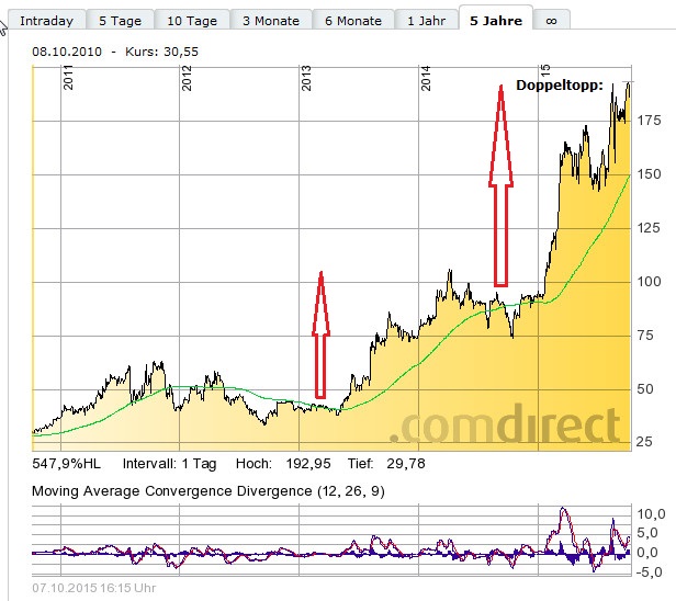Der aktuelle Anstieg könnte jetzt nachhaltig sein und (rein charttechnisch) bis ca. 220/230 führen.