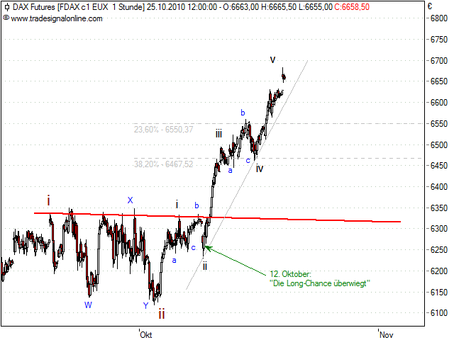 der DAX (Chart zeigt den FDAX) konnte bis heute Morgen alle am 20. Oktober genannten Kursziele von 6.594, 6.625 und 6.675 abarbeiten. Das Tageshoch lag zu Handelsbeginn bei 6.684. Seit der ersten Analyse vom 12. Oktober “Die Long-Chance überwiegt” konnte der FDAX um über 400 Punkte bzw. 6,8 % zulegen.