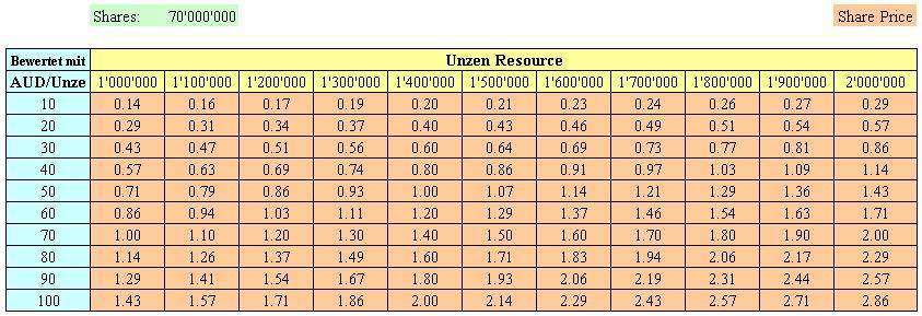 Hier mal eine kleine Übersicht mit einem möglichen Shareprice wenn man eine Resource von 1 - 2 Mio Unzen bestätigen könnte (bewertet mit 10 - 100 AUD pro Unze) u.a. bei Übernahme. Habe mal mit 70 Mio Shares gerechnet...