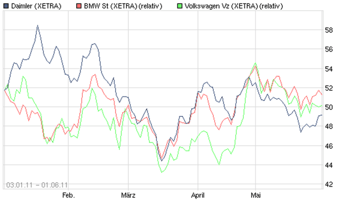 Die Kurse van BMW und VW Vz werden dann indexiertun umgerechnet auf Basis der Anfangskurs von Daimler.. das sind also relativer Charts.