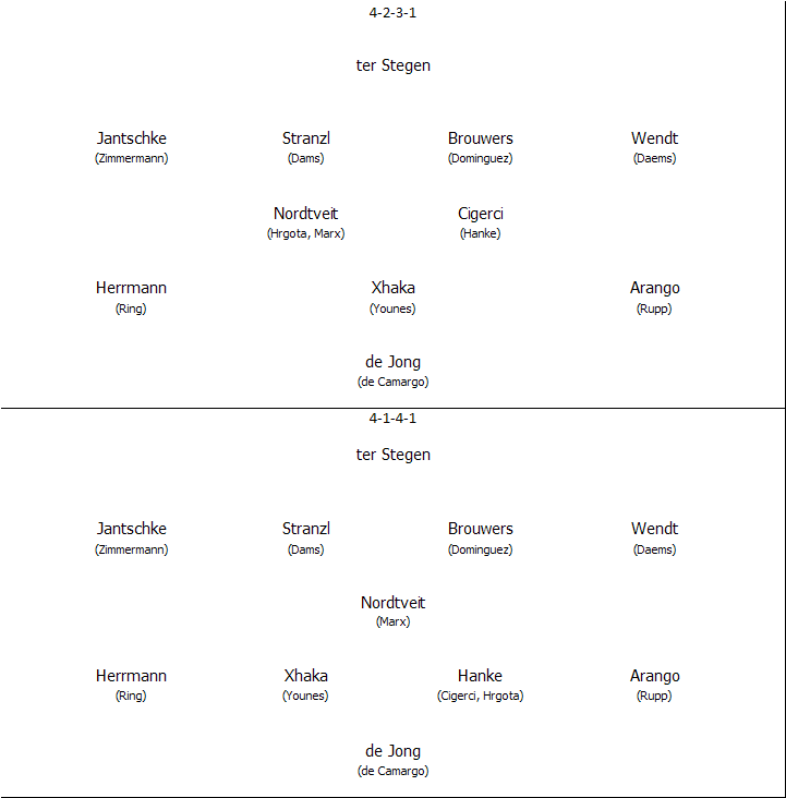 offensives­ Mittelfeld­: Herrmann (Ring), Hanke (zentral oder hängende Spitze als Ausweich),­ Arango