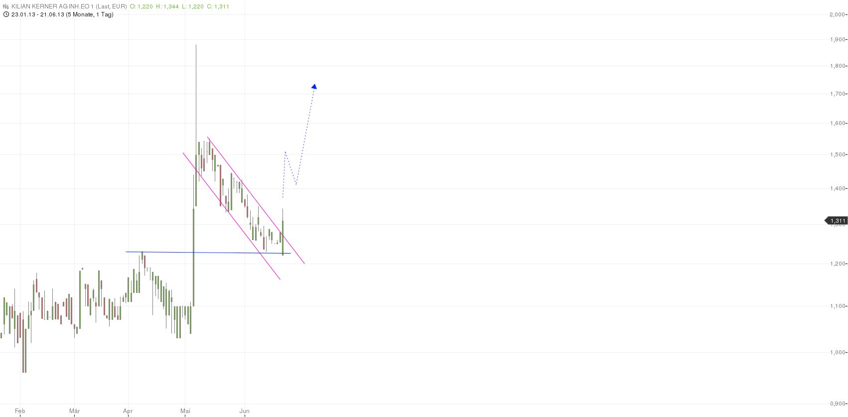 Fazit: Natürlich gibt es vielfältige Risiken bei Kilian Kerner. Das fängt bei den möglichen verwässerungen an und hört bei der Höhe der Gewinnmargen auf, die natürlich zu einem frühen Zeitpunkt noch schwer prognostizierbar sind. Da KK allerdings mittlerweile eine anerkannte Marke ist, halte ich zumindest die Umsatzprognosen für realistisch. Selbst wenn ich bei 40-50 Mio € Umsatz in 2-3 Jahren nur mit einer Ebitda-Marge von 7-8% rechne und mal eine Verdopplung der Aktienanzahl unterstelle, komme ich eine Ebitda-Multiple von 6. In dem Fall wäre wohl fair bewertet. Da ich aber mit einer höheren Marge rechne und hoffe das die verwässerung nicht ganz so heftig ausfällt, hat der Kurs durchaus sehr gutes Kurspotenzial. Viel hängt davon ab, ob sich die Marke Kilian Kerner in der oberen Mittelschicht (weitestgehend Frauen) durchsetzt oder ob das die letzten Jahre nur ein Hype war. Die Umsatzprognosen kommen aber nicht aus der Luft, sondern orientieren sich sicherlich an den erfolgten Vertriebsmaßnahmen. Das man 2013 den Umsatz vervielfacht und 2014 sicherlich nochmals verdoppelt, steht fü+r mich eigentlich außer Frage. Ob das dann nachhaltig ist, wird man sehen.