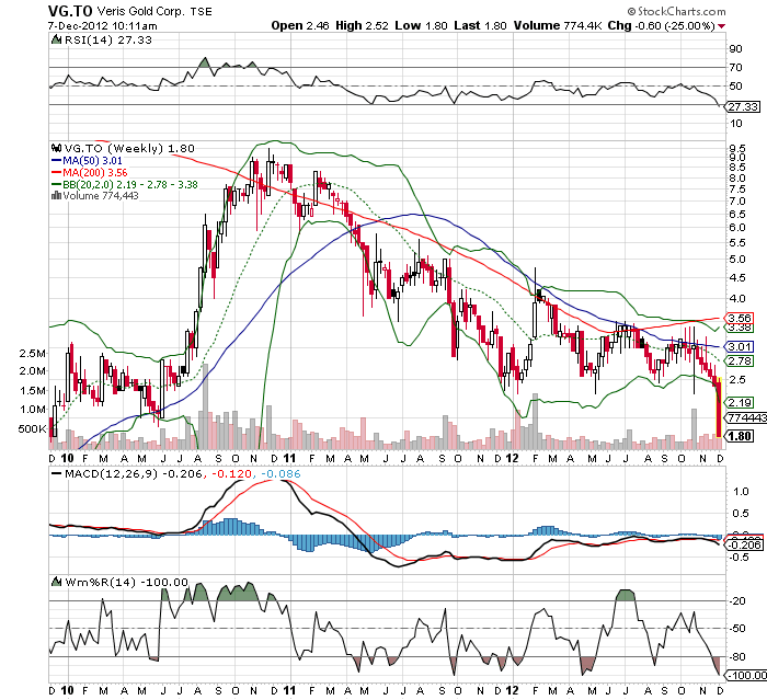 Vancouver, BC – December 7, 2012 – Veris Gold Corp. (TSX: VG) (OTCQB: YNGFF) (Frankfurt Xetra Exchange: NG6A) (the "Company"). The Company is pleased to announce it has filed a final prospectus supplement in connection with its previously announced offering of units ("Units") of the Company (the "Offering"). The terms of the Offering have been amended such that the Offering will now consist of up to 7,200,000 Units at a price of C$2.10 per Unit representing aggregate gross proceeds of up to C$15,120,000. Each Unit will continue to be comprised of one common share of the Company and one-half of one common share purchase warrant. Each whole warrant (a "Warrant") entitles the holder to purchase one common share of the Company for a period of 48 months following closing of the Offering at an exercise price of C$2.35.