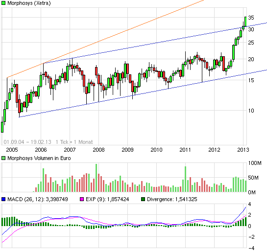 Ich fahre seit längerem die Strategie mich auf nur wenige Werte zu konzentrieren (i.d.R. 3), die den Hauptteil des Depots ausmachen können und die restlichen 10% nur als traderische Beimischung zu verstehen. Viel mehr Werte kann ich eh nicht intensiv covern, das macht es mir einfacher die Aktien auch wirklich zu verfolgen. Dass Morphosys die 50% Schwelle überschritten hat liegt neben einer Übergewichtung aufgrund des nun Long-Aufbaus von eigentlich beabsichtigten Tradingstücken v.a. daran, dass Morphosys so massiv gestiegen ist und ich einen Teil der anderen Aktien opportunistisch gegeben habe oder gezwungen wurde zu geben (z.B. Übernahme Medarex 2009, Micromet Anf. 2012) und Morphosys selbst 2012 so massiv gestiegen ist. Einen Teil der Tradingstücke auf dem Weg nach oben zu geben war auch nur logisch. Der andere Teil wurde zur Longposition zugeschlagen.