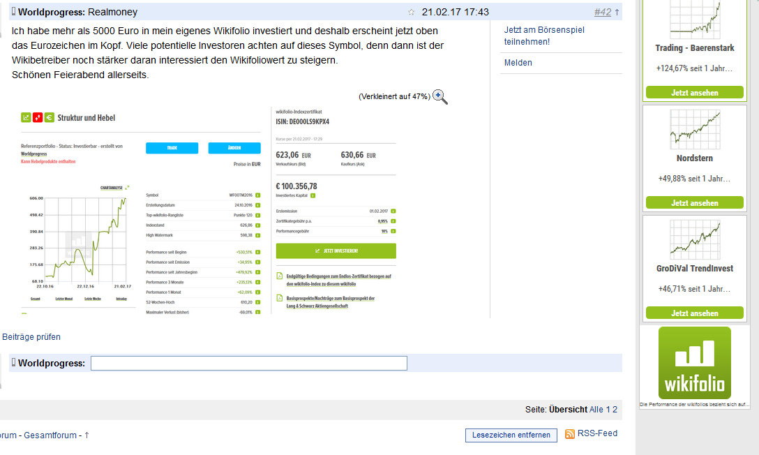 Also was ich Dir nochmal zeigen wollte. Wenn ich ARIVA aufmache und in mein Wiki schaue, gibt es rechts immer die Werbung von Wikifolio. Und immer tauchst Du rechts auf.