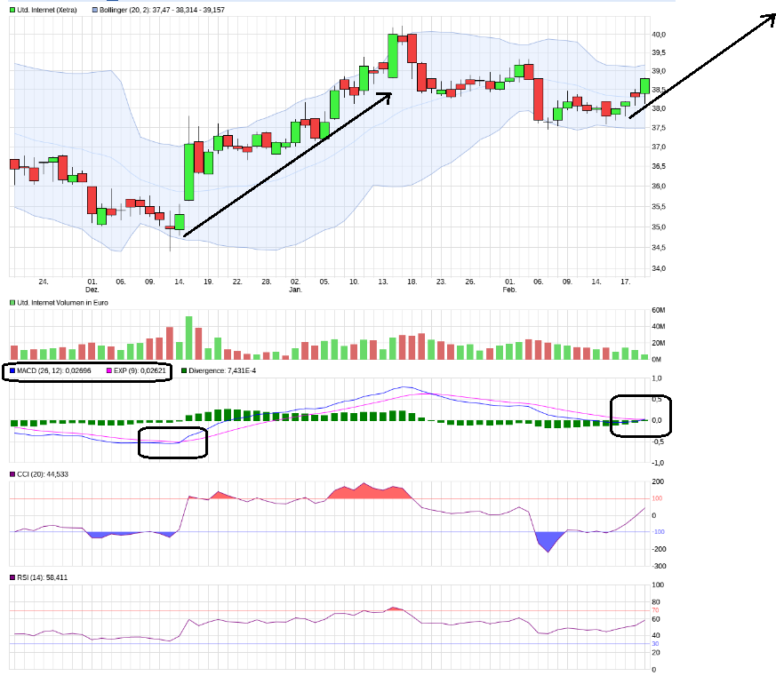 Die 2te Aktie ist United Internet die an der 38 50 Marke rum knabbert....Sollte es hier gelingen nachhaltig drüber zu kommen die Tage könnte der Widerstand bei 40,30 Euro angelaufen werden. Wie schon einmal gesagt hat die Aktie von United Internet am Markt sehr starken Nachholbedarf nach oben......gerade gibt der MACD ein sehr saghaftes Kaufsignal....