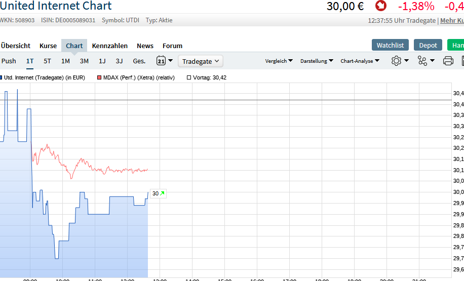 Und parallel stürzt leider die Dauerproblem-Tochter 1&1 Drillisch, an der UI mit fast 80% beteiligt ist, immer tiefer ab und belastet so natürlich auch zusätzlich klar den UI Kurs, da jeweils 1€ Verlust beim 1&1 Kurs ca. 130 Mio Wertverlust für Mutter UI bedeutet und UI die letzte Zeit schon wieder mehrere Euro gefallen ist. Was soll die hohen Belastungen der Seuchen-Tochter ausgleichen? Die Cloud-Sparte?!?! Da muß die schon brutal gute Zahlen und Prognosen bringen, wenn man eine fallende Dauerbleikugel wie 1&1 Drillisch klar überkompensieren will. Ein zunehmendes Problem: Ein IPO der Cloud-Sparte Ionos wird von Dommermuth sicherlich nicht in einem schwachen Börsenumfeld durchgezogen, wo der Markt wenig vorteilhafte IPO Kurse verspricht. Von daher kann es zwar sein, daß UI nach Ostern technisch schon bereit wäre für den Ionos-IPO, aber letztendlich die äußeren Bedingungen bestimmen wann die Sache über die Bühne gehen wird. Von daher rechnet der Markt vielleicht gegenwärtig jetzt doch nicht mehr mit einem so fix kommenden IPO, falls sich diese jüngste schlechte Börsenstimmung auch die nächsten Monate so weiter noch zeigen sollte. Solange die Unklarheit über den Ionos-IPO Zeitpunkt eher groß bleibt und parallel 1&1 noch nicht eine Bodenbildung erkennen läßt oder UI selber ein großes neues Kaufsignal im Chart erkennen läßt, bin ich hier weiter an der Seitenlinie und beobachte die Lage. Unschön würde es wohl, wenn man sogar noch unter 29,35 fallen würde in der laufenden Korrektur. Dafür müßte aber der Gesamtmarkt wohl nochmal klarer unter die Räder kommen und / oder UI selber etwas unerwartet negatives vermelden. Also mal abwarten wie sich zum einen jetzt die angespannten geopolitischen Dinge die nächste Zeit entwickeln, welche weiteren Zeichen FED&Co unter diesem Eindruck geben und was Dommermuth bei UI und 1&1 an Zahlenwerk bald präsentiert ( inkl. Aussagen zum kommenden IPO).