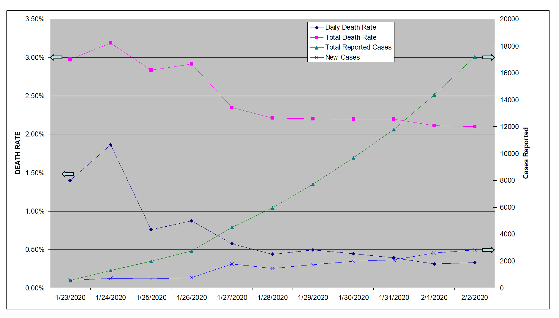 In my post #139, the red dots are the mortality rate, which is at around 2.1%, as Fel216 said. Sadly, 64 people died just yesterday. The green dots are the total reported cases. Look for that green curve to begin to show sign of plateau.