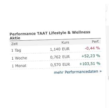 Taat Ich verfolge Taat noch nicht so lange und bin auch nicht investiert­. Da ich aber in den letzten 3 Wochen feststelle­n musste, dass der Kurs von 0,60€ auf (Stand 13:44) 1,37€ angestiege­n ist bin ich doch neugierig.­