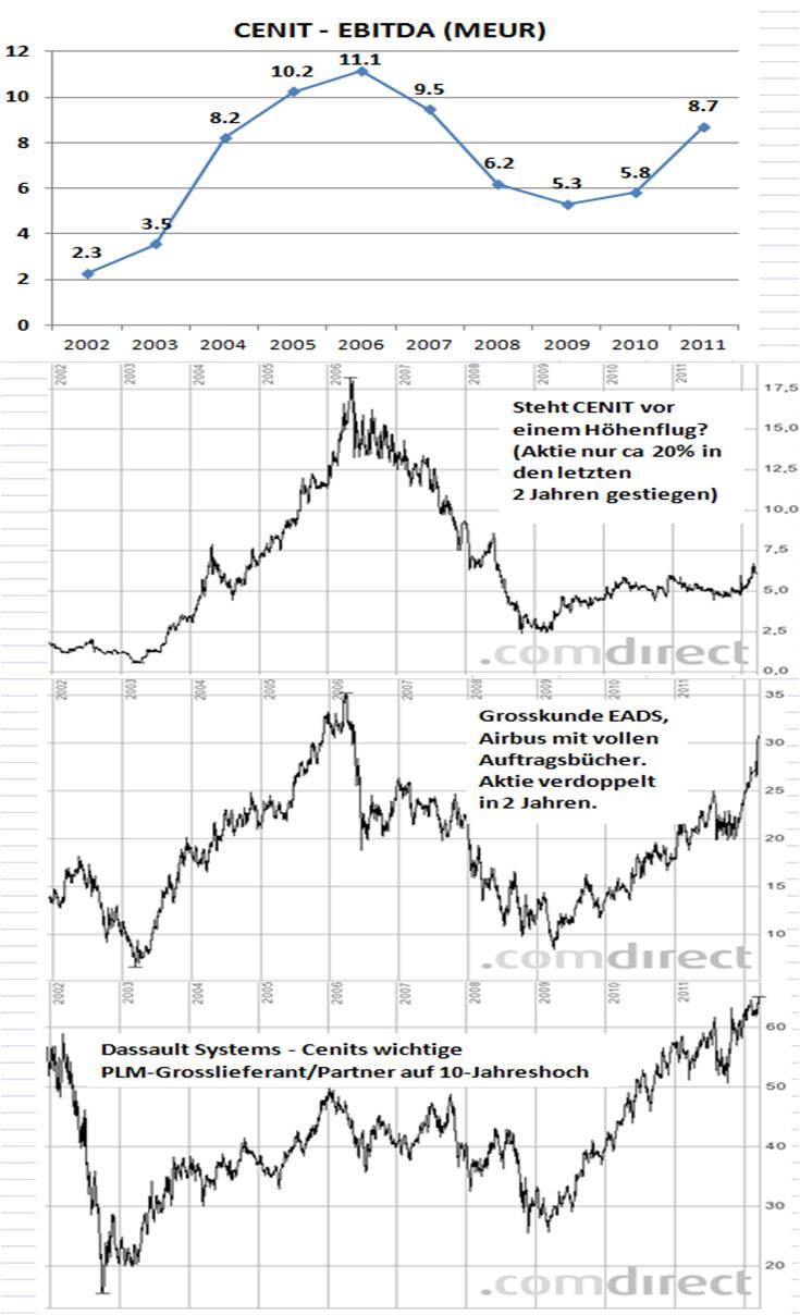 Wenn man den Umfeld (Automotive, Aerospace etc) betrachtet sieht es positiv aus. Maschinenbaufirmen für den Automotivebereich wie Schuler, Dürr etc melden grossen Aufträgen. BMW, Daimler, Volkswagen investieren stark die kommenden Jahren. Airbus Auftragsbüchern sind für mehrere Jahren voll. Die Rahmenbedingungen für CENIT waren seit Jahren nicht so gut. Ich gehe davon aus, dass auch CENIT davon im 2012-2013 profitieren wird. Wenn es CENIT gelingt, viel eigene Software in den Projekten mitzuverkaufen können wir an den alten EBITDA-hochs hoffentlich anknüpfen. Am Peak war die Aktie mit 18 EUR bewertet, d.h. es gibt Luft nach oben wenn der Markt bullisch ggü CENIT wird.
