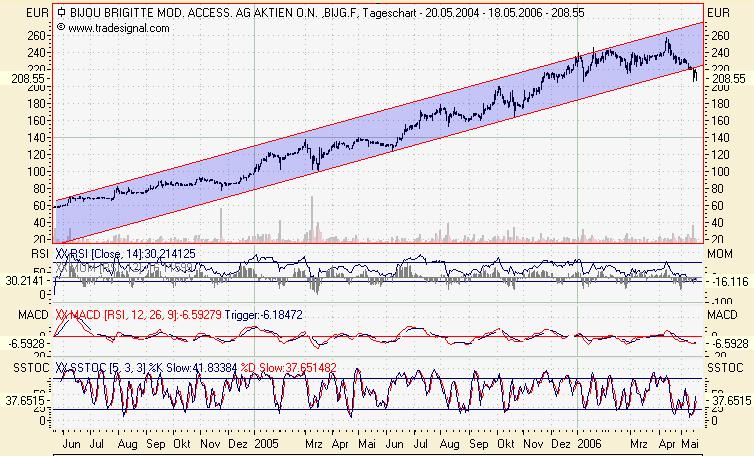 Ein Vergleich mit Puma ist an dieser Stelle vielleicht angebracht. Vor zwei Jahren war Puma ungefaehr in derselben Situation wie jetzt Bijou. In den Jahren 2002 und 2003 hatte Puma den Gewinn jeweils mehr als verdoppelt, aber im ersten Quartal 04 betrug das Wachstum "nur noch" 65%, mit einem noch schlechteren Jahresausblick (30%). Daraufhin fiel der Kurs, der vorher nur gestiegen war, um in der Spitze ueber 25% und duempelte ein ganzes Jahr lang auf etwa demselben Niveau vor sich hin. Hier die Wachstumsraten fuer die einzelnen Quartale: