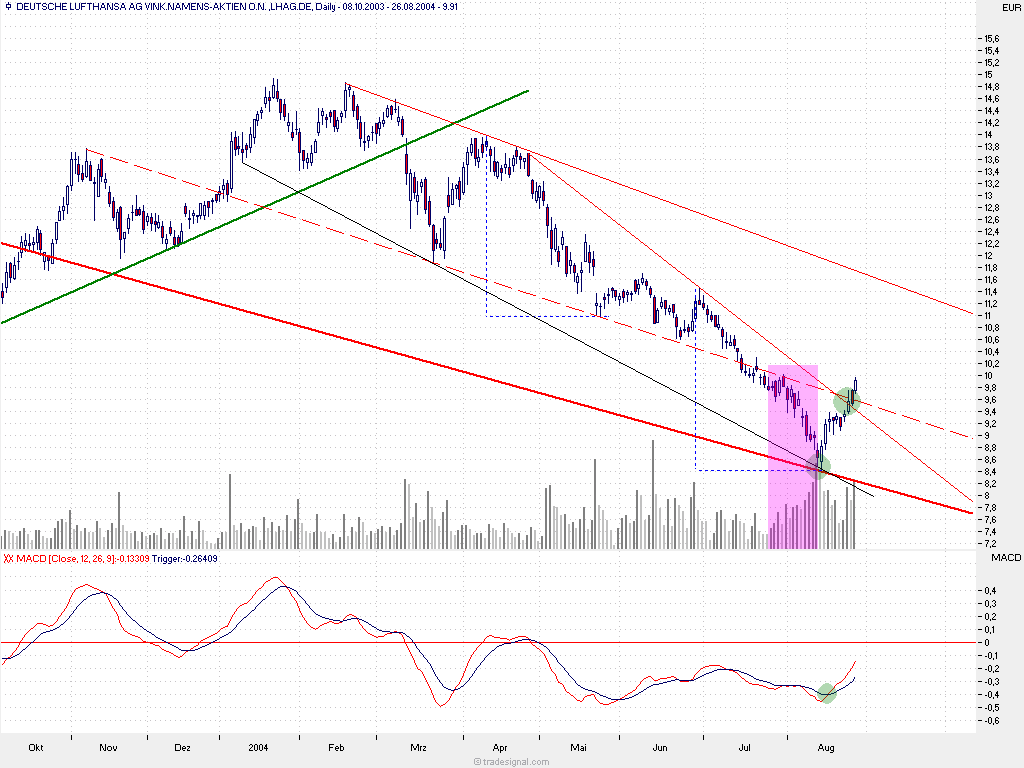 seit der empfehlung im BB am 19.08. läuft der kurs.. der break der 9,60 war sehr wichtig aus trendtechnischer sicht. heute erneut ganz vorne mit dabei.. stärkster gewinner im dax mit 4%! bei 10 stehen nur 2 KO's, aber einer der DB.. hier heisst es vorerst gewinne laufen lassen..wobei wir an einem kritischen kursniveau angelangt sind.. gleich 2 retracements verteidigen vorerst die zone.. das 50er der letzten downbewegung (11,5/8,50) & das 23er des kompletten downmoves seit 15,50.. es schadet also nichts die position abzusichern, zumal wir seit tief auch schon wieder über 18% im basiswert gelaufen sind!