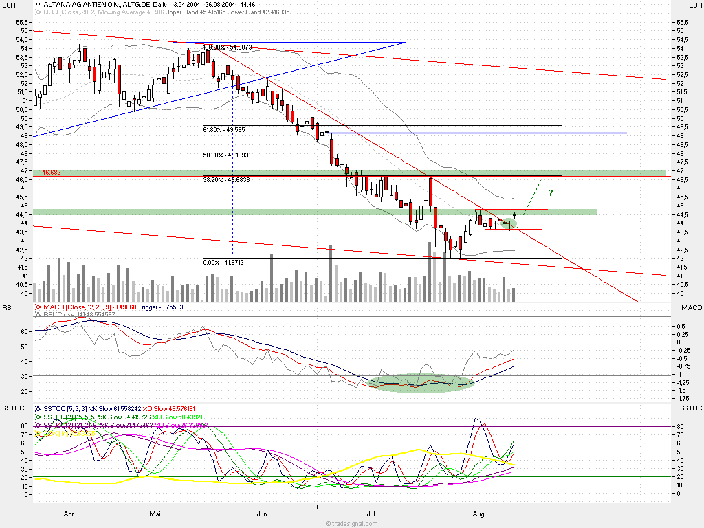 altana ist zumindest vorerst mal aus dem großen downtrend raus.. aber mir fehlt definitiv ein deutlicher impuls nach oben, damit das ziel bei 46,70 ins auge genommen werden kann. d.h. ein zusätzlicher ausbruch muss her.. relativ einfache situation, denn ein level dafür befindet sich schon bei 44,65/44,75(!). darüber sieht es also klar long aus. ein SL level befindet sich am unteren rand der range unter 43,60.. ein fall unter 44 wäre intraday ebenfalls negativ zu bewerten.