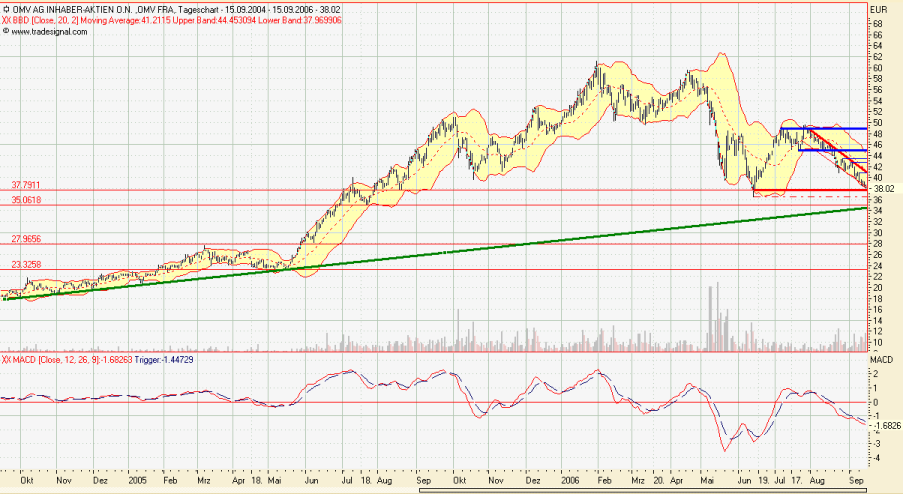Die Unterstützung bei 35 Euro sehe ich als die letzte an, die den Kurs jetzt noch nach unten begrenzen kann. Ob es allerdings so tief gehen muß, weiß ich nicht genau. Wenn die Unterstützung, genau wie eine Trendlinie, durchbrochen wird, dann ist es keine solche mehr. Wenn der Schlußkurs dann auch noch darunter/darüber liegt, gilt es ein völlig neues Bild zu finden. Das vorher betrachtete ist dann als nicht mehr existent zu betrachten. Also beginnt ein M auch im Juli 2005 bei 35 Euro und könnte jetzt im September bei 35 Euro aufgelöst werden. Meistens werden diese Zielmarken nur mit dem Docht der Kerze erreicht. Siehe auch den link zu wallstreet-online. Und nu sagt mir, ob das stimmt. Sonst muß ich noch mal so ein Seminar besuchen.