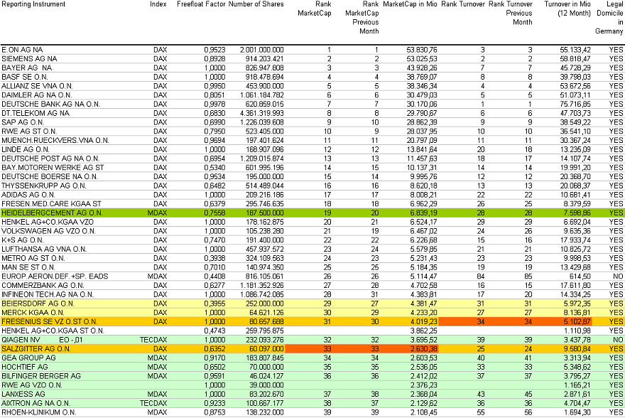tja, HeidelbergerCement hätte das Entry-Kriterium (30/30) zwar erreicht, aber leider dürfte noch kein Absteiger bereitstehen. Wackelkandidaten wären vor allem Salzgitter (Platz 33 nach MK) und Fresenius (Platz 34 nach Umsätzen). Da müsste sich also bis Ende Februar noch was zugunsten der Heidelberger tun. Schaun wa mal. Morgen dürfte erstmal die nächste Rangliste zu Dax und Co rauskommen. Ich erwarte HeidelbergerCement dabei auf den Plätzen 21 (MK) und 28 (Börsenumsatz).