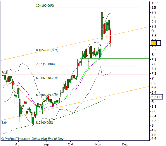 19.11.2007 - Nachdem die Aixtron-Aktie am Ausbruch über die psychologisch wichtige 10-Euro-Marke gescheitert war, folge im Rahmen der Konsolidierung ein Rückgang bis an eine wichtige Supportzone. Diese, gelegen oberhalb von 7,80 Euro, bestimmte in weiten Teilen das charttechnische Bild des Oktobers und wurde am Freitag getestet. Der Aixtron-Kurs fiel bis in den Bereich oberhalb dieser Marke, schloss den Handel allerdings erholt bei 8,10 Euro. Damit sind Chancen vorhanden, dass ein Boden gefunden wurde. Nach oben hin ist im Bereich von 8,50/8,62 Euro nun der nächste Widerstand zu finden. Ein Ausbruch hierüber kann zu einem Anstieg zurück in Richtung 10 Euro führen.