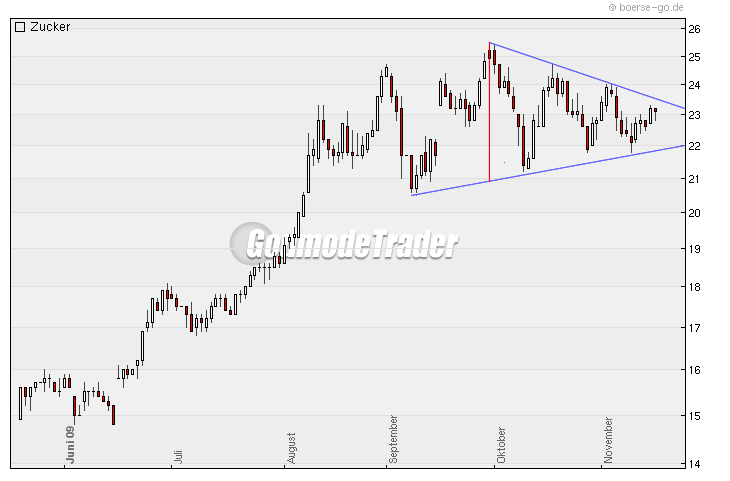 Im heutigen Handelsverlauf durchbrach Zucker den Keil nach oben hin. In der Spitze