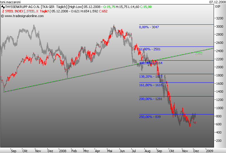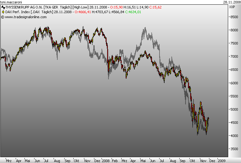 Also diese Woche hatte sich die TK Aktie von ihrer positiven Seite gezeigt. Am Montag sehen wir feste Kurse über den 16 € bis an die 17 € reichend. Wir erhalten starken Rückenwind vom DJ, der sich auch am Freitag stark präsentierte. Der DAX könnte schon am Montag die 4800 Punkte Marke überschreiten und sie über einen längeren Zeitraum halten. Wieder hat sich einmal bestätigt, dass TK eine sichere Anlage geblieben ist und sich schon im nächsten Jahr, also ab September 2009, wieder stärker präsentieren wird. Wir müssen uns die anstehenden Bundestagswahlen vor Augen halten. Unabhängig davon wer die Macht in Deutschland übernehmen wird, muss die wirtschaftliche Kraft Deutschlands vorantreiben und wenn es nur über einen "künstlich hervorgerufenen" Boom am Amfang zu meistern sein wird. Lehnt euch zurück und genießt die Tatsache einer der besten Aktie - auf lange Zeit gesehen - zu bestzen. Ein schönes Wochenende wünsche ich euch.