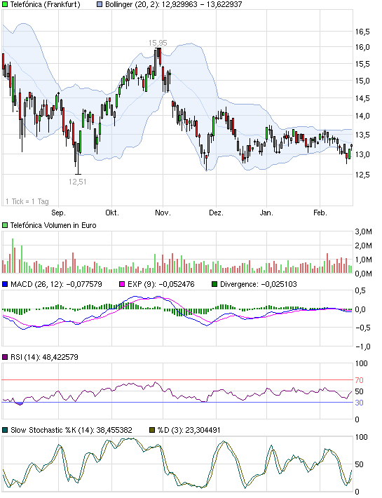 >Es gibt viel positives bei der Telefonica und eben auch Schattenseiten, das Wachstum geht leider zurück wie du selber lesen konntest also wird sich das wohl oder übel auch auf den Kurs auswirken! Wenn Sie in China vorankommen sollten dann wäre das wieder ein Schub nach obben! Also wenn Sie Charttechnisch nicht unter 12-12,50 fallen sehen ich hier eben auch bessere Chancen als bei einer T-kom …> <<