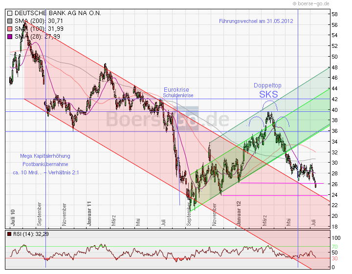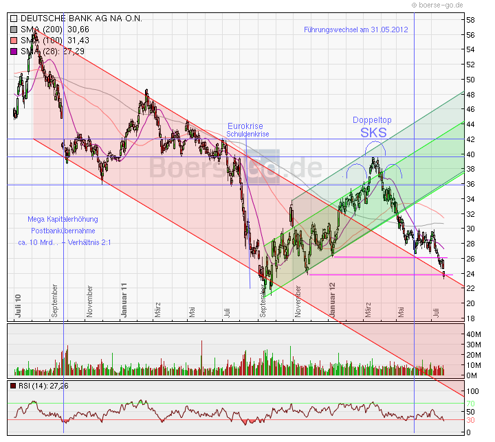 DB ist bei 25,50 € Kurs keine 24 Mrd. an der Börse mehr wert. Jetzt können wir nur abwarten, was in den kommenden Tagen, Wochen und Monaten passieren wird. Als nächstes kommen die Quartalszahlen II, dann wird sich zeigen, wohin sich der Libor-Skandal hin entwickelt und zu guter letzt, was wird aus dem Eurokasperletheater und der Weltkonjunktur?