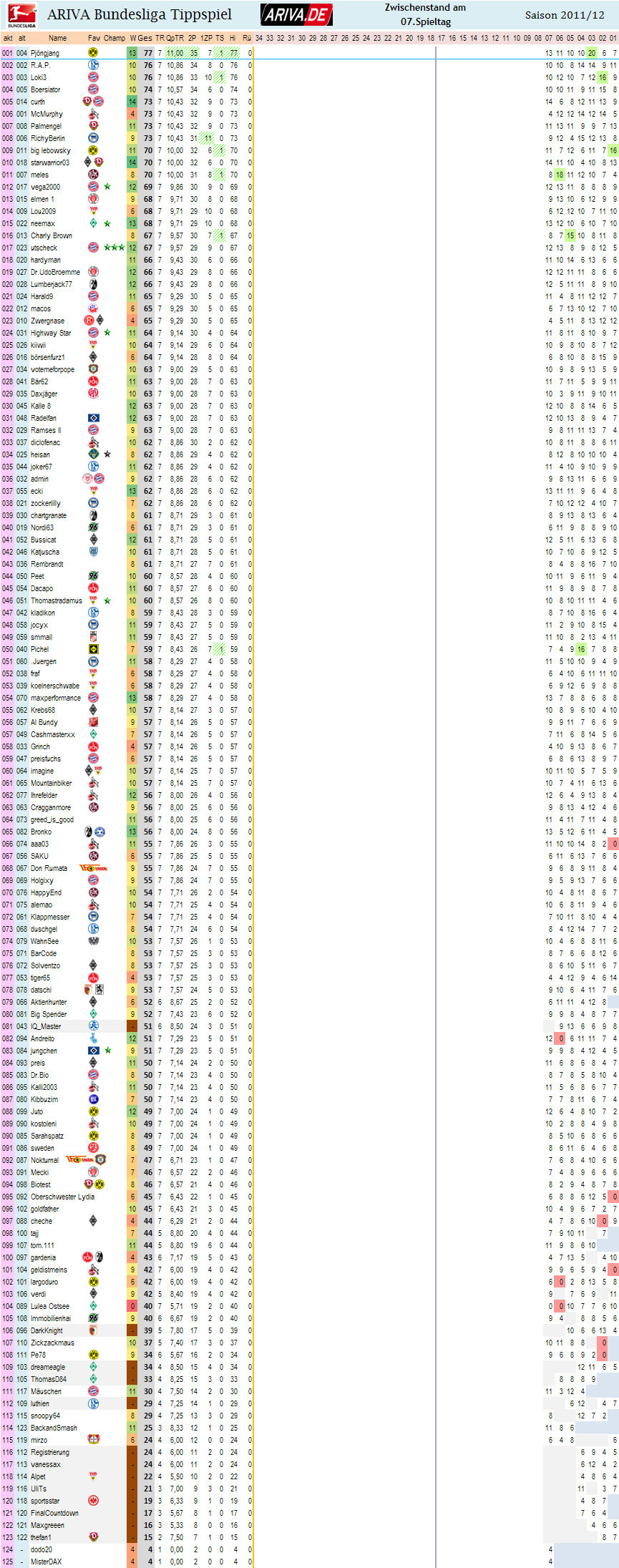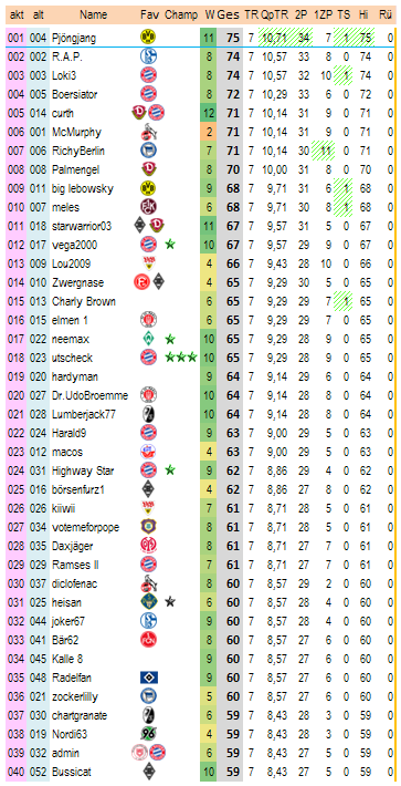 was auffällt.. immer mehr Meister pirschen sich heran.. Grad auch utscheck schon in den Top 20... Die, die 2-4 Pkt nur bis jetzt haben, gehts runter..