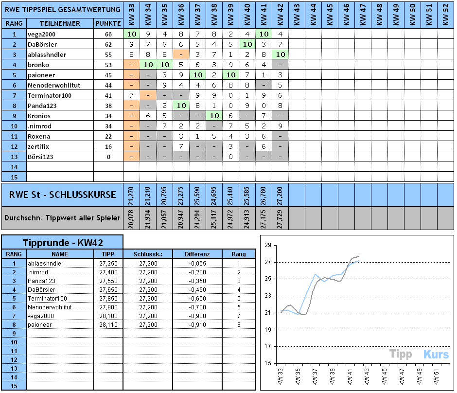 Zurerst zur Auswertung der KW42: ablasshndler macht verdient seinen ersten Sieg ein und schiebt sich somit wieder auf Platz drei und somit vor den ausgeschiedenen bronko.