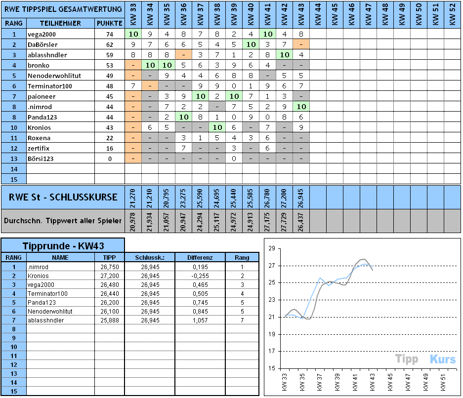 Heute startet RWE ansich schon gut in die Woche - noch 1 grüner Tag und wir sind wieder im Trend der letzten Wochn drinnen. Es war ja die erste rote Woche seit KW38.