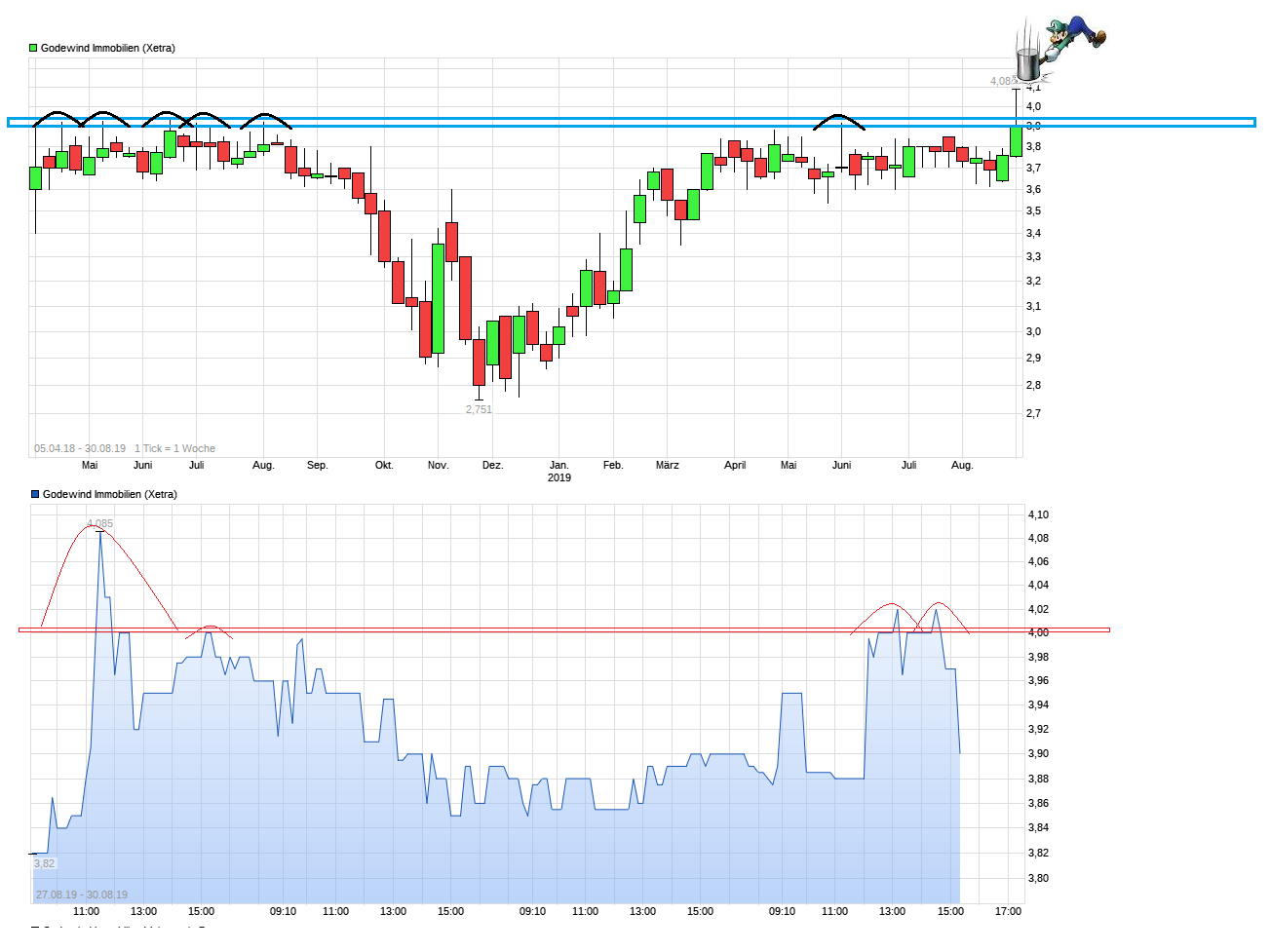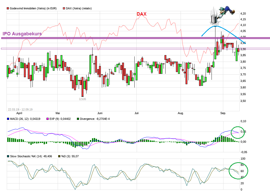 Der kurzzeitige Kurssturz am 11.10 könnte mit den Verwerfungen bei WeWork zusammenhängen. Die standen ja finanziell auf der Kippe nachdem sie mit Godewind neulich den Riesenmietvertrag für Düsseldorf abgeschlossen hatten, da hätte uns eine Insolvenz schon auch getroffen. Nachdem Softbank vor ein paar Tagen die Übernahme und finanzielle Rettung von WeWork bekanntgegeben hat ist hier der Kurs ja auch kurzfristig von 4 auf 4,25 hochgeschossen.