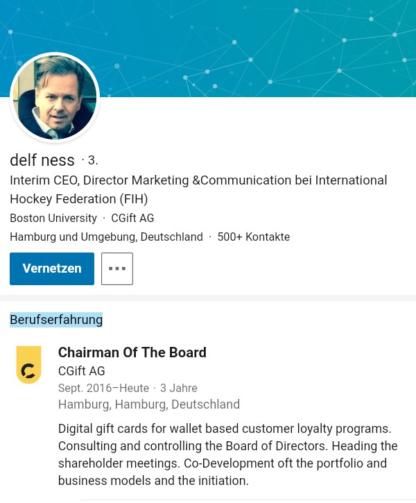 Vorstand Bergeron, der mehr als 10% der Aktien der CGift AG hält, ist m.W. ausser in Bezug auf seinen Besuch bei der Tyros-HV im April 2018 noch kein einziges Mal in Bezug auf die CGift AG öffentlich in Erscheinung getreten. Auch sein LinkedIn-Profil hat kaum Kontakte und keinerlei Bezug zur NGG oder CGift AG. Auf der HV im April 2018 hatte er ja, wie im Bericht von GSC-Research nachzulesen, auch über seine Kontakte nach Taiwan berichtet, so dass auch dort zumindest perspektivisch die Geschenkkarten angeboten werden sollen. Und seine Heimat USA sollte ja dann sicher auch irgendwann auf der Agenda stehen. Mal schauen, was uns die Herren in nächster Zeit berichten werden.