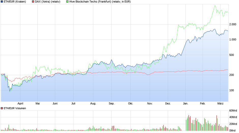 Ethereum hat Bitcoin in den letzten 12 Monaten weit übertroffen. BTC ist um 815% und ETH um 1.336% gestiegen.