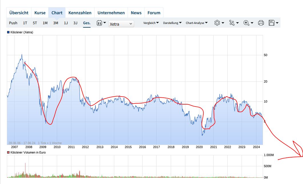 Wenn ich mich noch recht erinnern kann, bezahlte Friedhelm Loh im Frühling 2023 ein Pflichtangebot von 9,75 € je Klöckner-Aktie. Das wirtschaftliche Eigenkapital liegt bei knapp 17 € pro Aktie. Andere Nebenwerte sind auch unterbewertet, das stimmt leider! Während der Dax bei knapp 19.000 Punkten notiert, liegen viele Nebenwerte auf tiefem Baisse-Niveau. Alte Börsenregeln stimmen nicht mehr. Es gibt auch keine Nachzügler-Hausse mehr bei Spezialwerten und bei solchen vergessenen Aktien wie Klöckner.