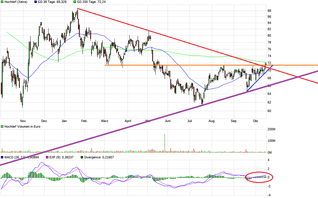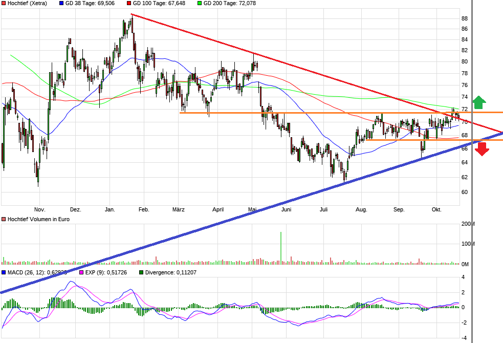 Ich könnte mir vorstellen, dass diese Q3-Zahlen die Sache entscheiden werden. Aus charttechnischer Sicht kann man das aber gelassen abwarten. Geht es unter 67,0-67,5 €, wäre die Sache wieder klar bearish. Ob man deshalb verkaufen muss, wenn man fundamental von der Aktie überzeugt ist, muss dann jeder für sich entscheiden. Aus technischer Sicht ist aber zumindest ein Zukauf dann erstmal nicht sinnvoll. Geht es über 72,0-72,5 €, wäre die Aktie wirklich klar bullish, und man müsste fast schon zwingend zukaufen. Die knapp 5 € dazwischen sind Niemandsland.