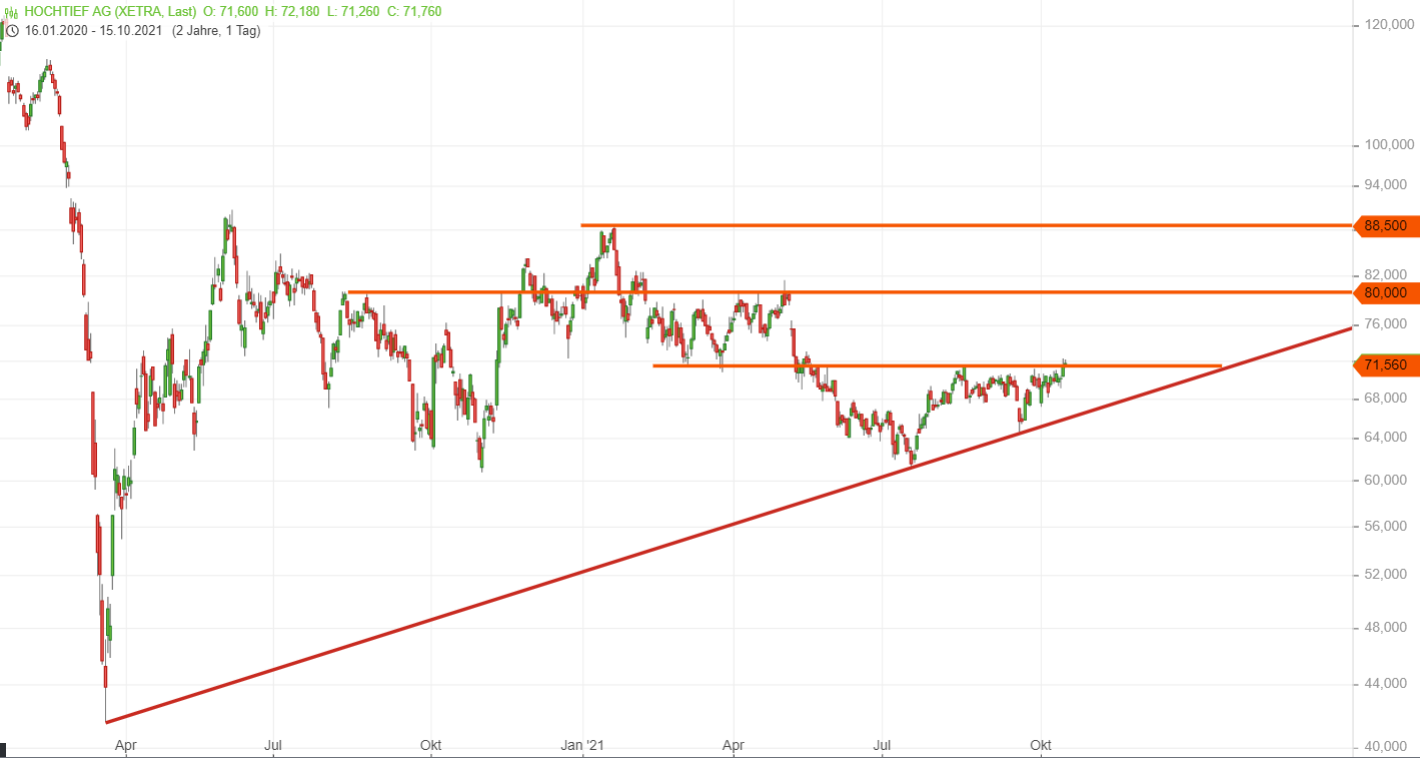11.03 Uhr - Starke Zahlen der Beteiligung Cimic ermuntern Anleger zum Einstieg bei Hochteif. Die Aktien des Baukonzerns steigen um zwei Prozent. Cimic gewinnen an der Börse Sydney knapp sechs Prozent. Das Unternehmen fuhr in den vergangenen Monaten Aufträge im Volumen von umgerechnet 10,3 Milliarden Euro ein, mehr als vor Ausbruch der Coronavirus-Pandemie. Der Umsatz wuchs um 9,2 Prozent auf sieben Milliarden Euro.