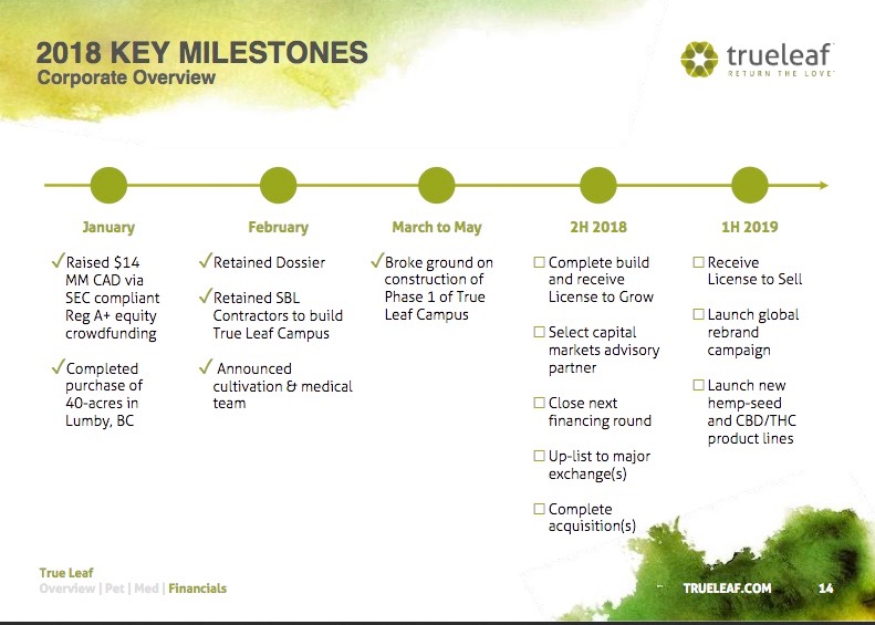 Der Bau des True Leaf Campus wird voraussichtlich im Herbst 2018 abgeschlossen sein. Der Besitz des 40 Hektar großen Geländes in Lumby bedeutet, dass das Unternehmen gut positioniert ist, um die zukünftigen Marktanforderungen zu erfüllen.