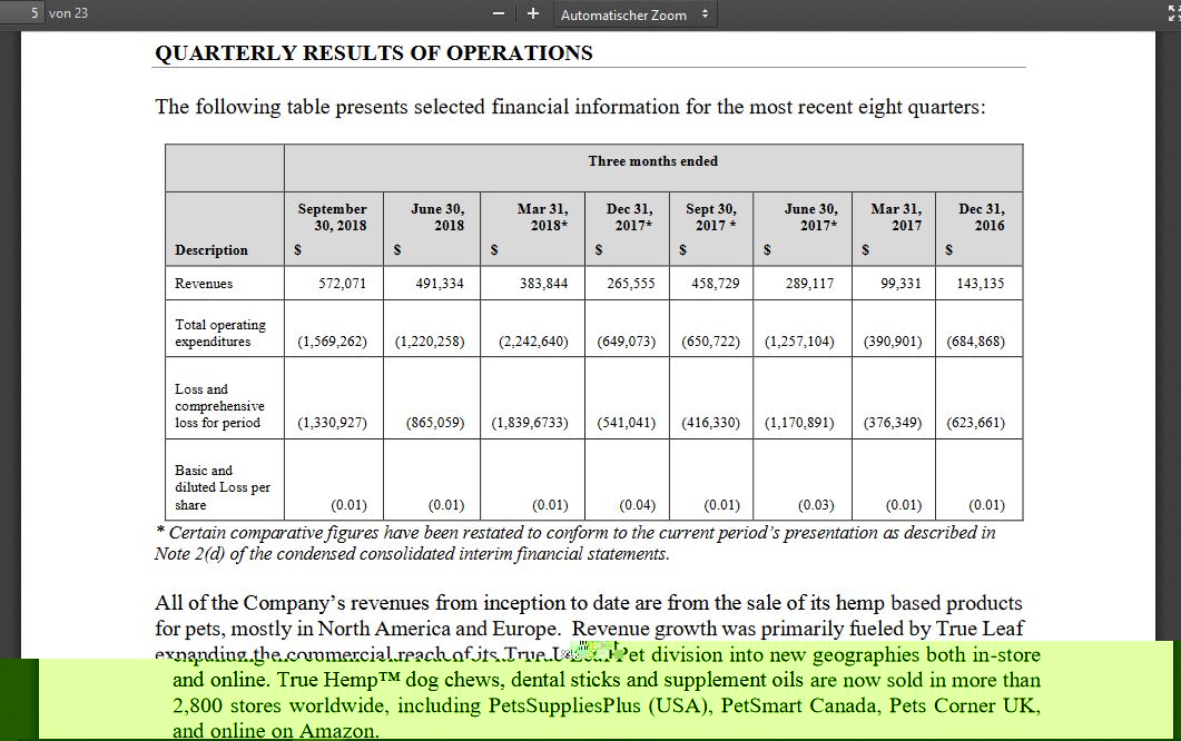Die Einnahmen wurden aus dem weltweiten Verkauf der legalen, auf Hanf basierenden True Leaf Pet-Produkte des Unternehmens erzielt. Der Umsatz der Produkte belief sich auf 572.071 USD (CAD) und ist damit das zweite Rekordquartal des Unternehmens in Folge.