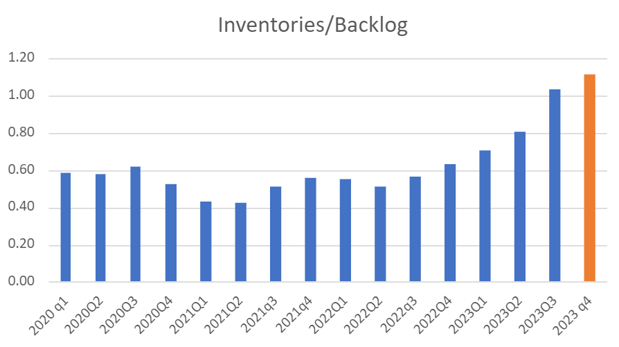 The CFO was saying the inventories/backlog ratio should move toward the normal ratio of 0.5-06 in the Q123 CC, yet the ratio went up to 1.14! What happened? Backlog actually decreased from Q3 to Q4, and inventories increased from 380m to 395m. I will share some thoughts on this later.