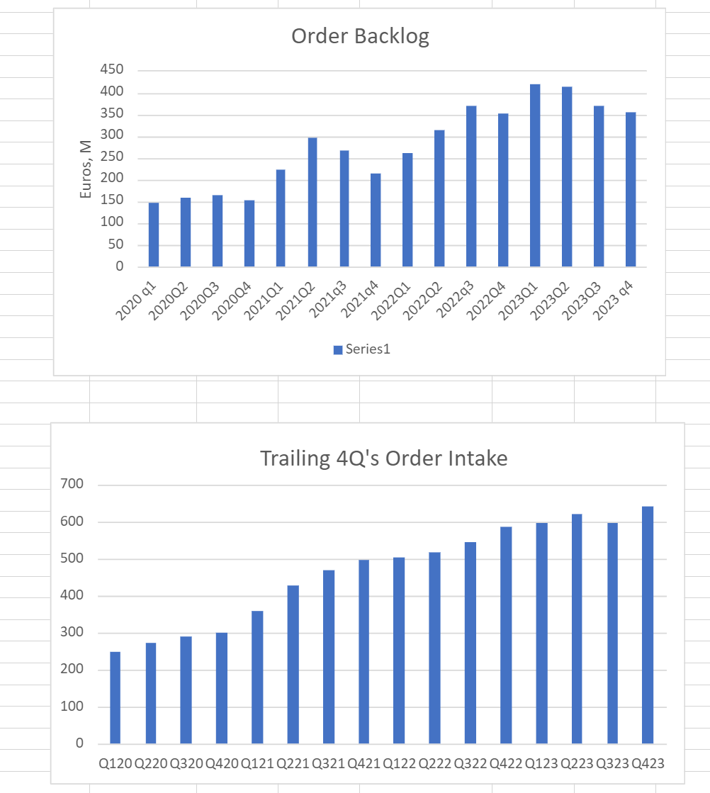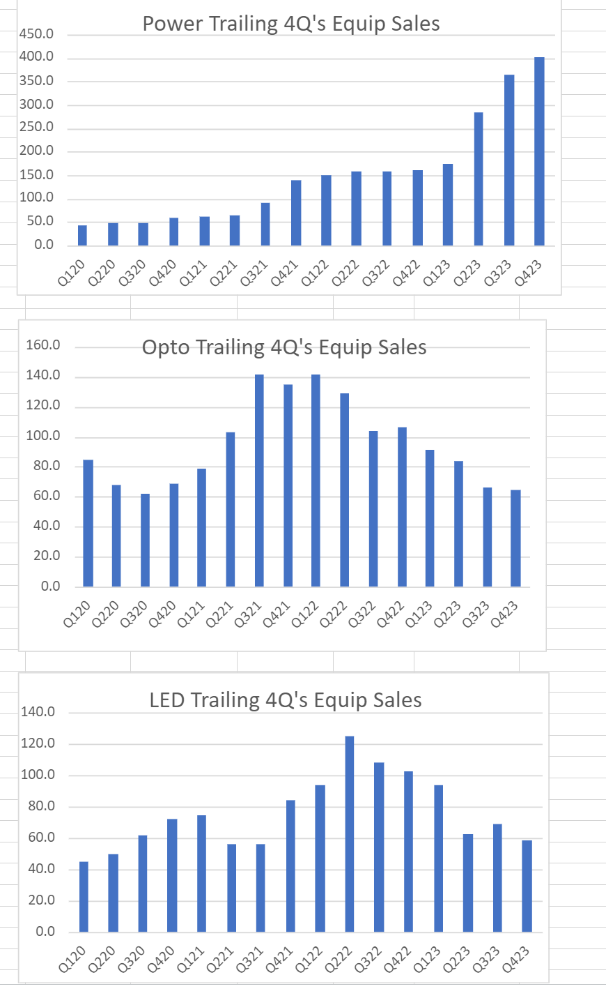 Equipment sales is ~ 85% of the total revenue. If Opto and LED contribute 100m each to equipment sales, they would contribute 235m rev. If Power stays at 400m, it would contribute 470m to rev. Adding up, that would be the 705m projected 2024 sales, the upper end of the guidance that Felix talked about in the CC.