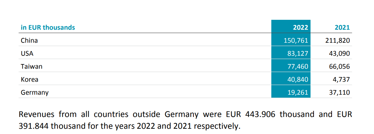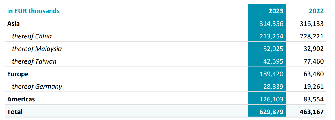 Aixtron generated 213m rev from China which increased from 2022; the 2022 China sales of 228m is an error, see next post. Adding sales from the three Asian countries equals 308m. So sales from Korea + Japan were only about 6m in 2023. Those two have great potential for Aixtron in 2024, growing from very low bases, thinking Samsung, SK Siltrons, Rohm, etc. The 52m sales from Malaysia must be the Osram plants for microLED. No sales from Infineon's Malaysia plans, yet?
