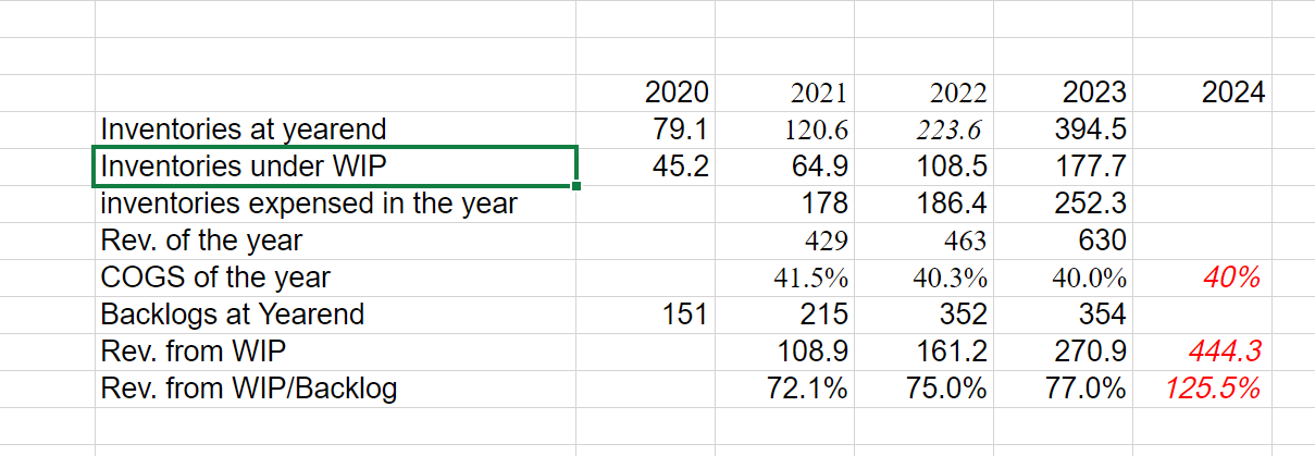 Is 2024 turning into an exceptional year? The inventories expensed each year is always bigger than the yearend total inventories the year before. A 2023 yearend 395m total inventories imply 395m/40%= 988m future sales. You make the call.