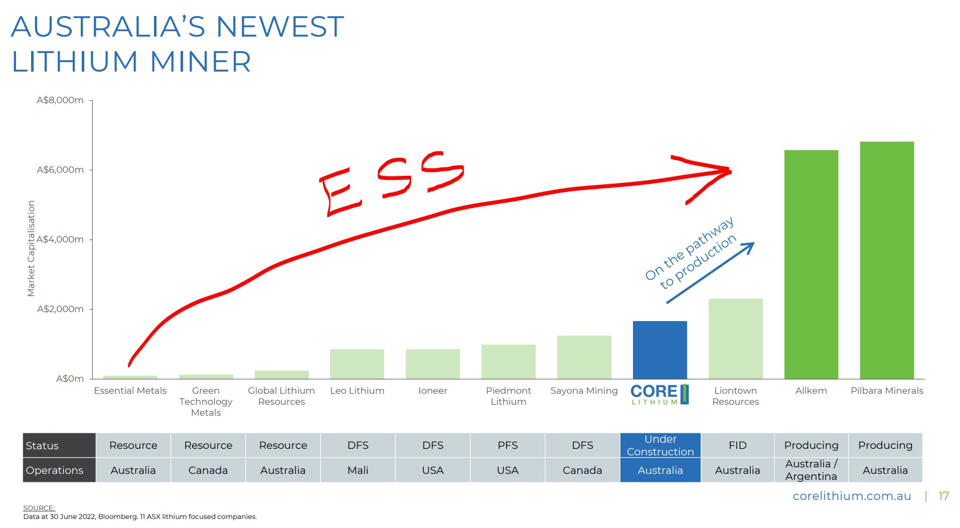 Hier sieht man schön die Marktkapitalisierung der Lithium Firmen in Australien und ihren aktuellen Entwicklungsstand, hin bis zur Produktion....ESS ist genau auf diesem Weg.
