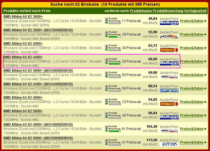 Ich hab mir deshalb zum Spaß einen Billigst-Zweitrechner von AMD gebaut. Er hat den Athlon X2 4400 (Brisbane-Kern - mit 65 nm und 65 Watt wie der E6600). Diese CPU gibt es jetzt zum Spottpreis von nur 68 Euro (ich hab vor zwei Wochen noch 70 Euro gezahlt). Dazu nahm ich ein Mainboard mit eingebauter Chipsatzgrafik, befeuert vom neuen ATI-Chipsatz AMD690 (diese Koproduktion von AMD und ATI enthält eine ATI 1250 Mobility). Dieses Mainboard (Asus M2A-VM) kostet nur 50 Euro, und man benötigt keine separate Grafikkarte. Mainboard und der Athlon-X2-4400 sind ZUSAMMEN also billiger als die Intel-CPU allein, die immer noch 180 Euro kostet.