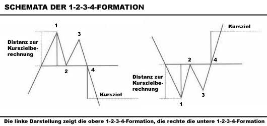 Wie der Name 1-2-3-4-Formation schon sagt, setzt sich die Methode aus vier verschiedenen Punkten im Chart zusammen. In Wie der Name 1-2-3-4-Formation schon sagt, setzt sich die Methode aus vier verschiedenen Punkten im Chart zusammen. In Bild 1 sind die beiden Möglichkeiten graphisch dargestellt, die es auszunutzen gilt. Im Falle einer oberen 1-2-3-4-Formation spekulieren wir auf einen kurzfristigen Kurseinbruch. Notwendig sind hierzu zwei eng beieinander liegende Hochs, wobei das zweite allerdings nicht mehr das Niveau des ersten Hochs erreichen sollte. Dieses erste Hoch bezeichnete Gann mit 1, das zweite Hoch mit 3. Das Tief zwischen dieses beiden Hochs wird mit 2 gekennzeichnet. Interessant wird es nun, wenn die Kurse nach der Ausbildung des zweiten Hochs wieder auf das Niveau von Punkt 2 zurückkehren. Sollten sie darunter gehen, ist das der Zeitpunkt zum Shorten.