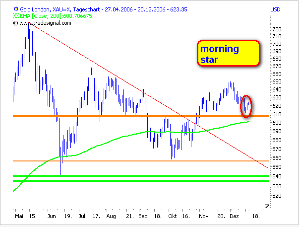 "Charttechnische Formation aus der Kerzenchart-Analyse. Ein Morning Star ist nach einer Abwärtsbewegung ein zuverlässiges Umkehrsignal. Er benötigt zur Ausbildung drei Handelstage.