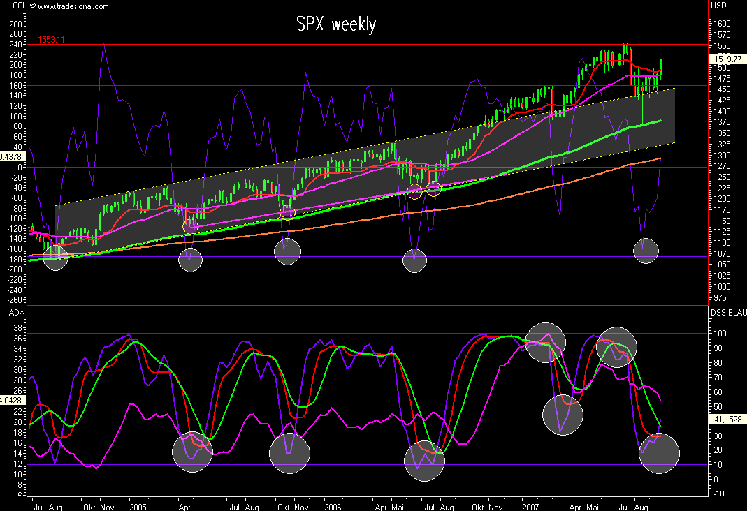 balb aufpassen müssen, bereits gestern gab es im SPX weekly ein klares Kaufsignal, sogar bei fallenden Preisen, heute hat sich das Signal bei stark steigenden Preisen bestätigt, deshalb war ich heute so bullish für den Dax auch ohne Signal